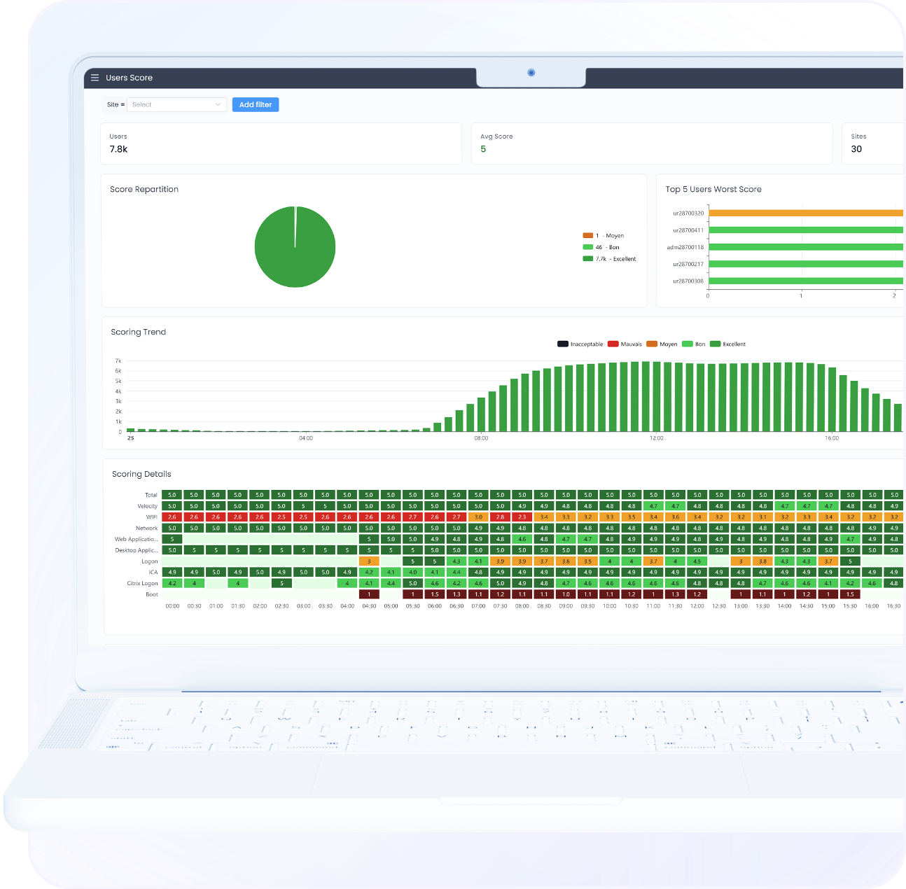 easyOptima DEX offre une visibilité complète avec plus de 250 KPI, vous permettant de suivre les postes de travail en temps réel et d’agir rapidement. Grâce à sa capacité à analyser les tendances, la solution détecte les dérives de performance et anticipe les problèmes de manière proactive, permettant de résoudre les incidents avant qu’ils n’affectent les utilisateurs.