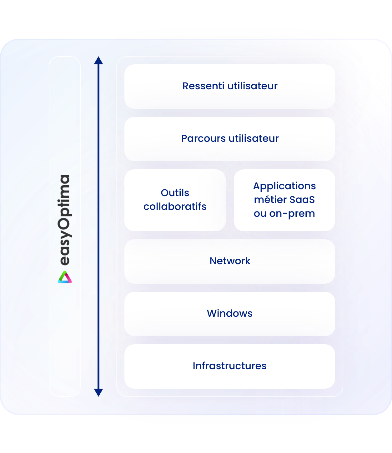 easyOptima Diag collecte en temps réel les données sur les postes de travail des utilisateurs avec une vision full-stack. Grâce à ce dataset parmi les plus riches du marché, les membres du support, ingénieurs Workplace et experts applicatifs diagnostiquent rapidement et précisément les problèmes des utilisateurs.